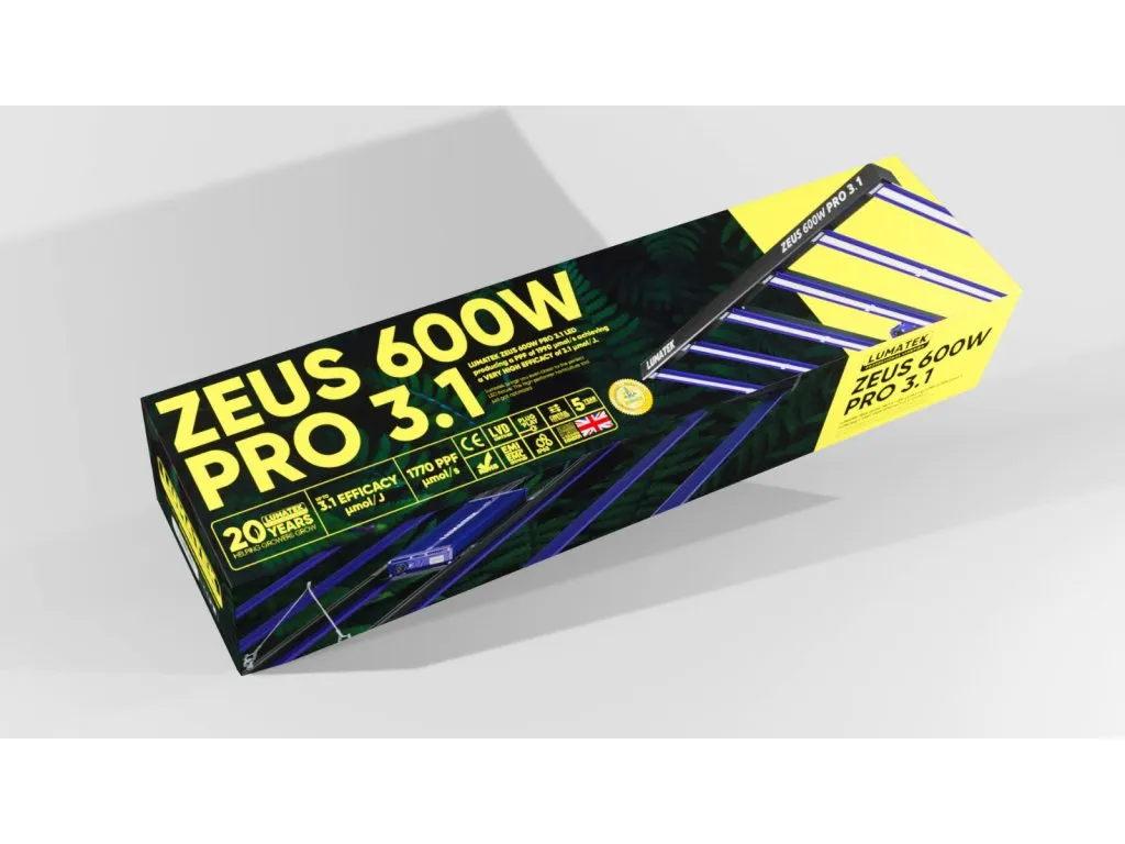 Lumatek Zeus 600 W Led PRO 3.1 Grow Light je cenovno ugodna nastavljiva visokokakovostna svetilka s polnim spektrom. Lumatek Zeus 600 W LED PRO 3.1 je linearna več svetlobna palica, ki proizvaja PPF 1990 µmol/s in fotonsko učinkovitostjo (fixture efficiency) 3,1 µmol/J. Niz LED diod ustvarja na kratki razdalji do pridelka, enakomerno širjenje svetlobe, kar omogoča, večplastno gojenje. Zeus je izdelan s pomočjo visokokakovostnih gonilnikov Lumatek in vrhunskih LED svetilk podjetja Osram in Lumileds Philips, ki ustvarjajo poln spekter svetlobe, idealen za vegetativne in cvetoče cikle.