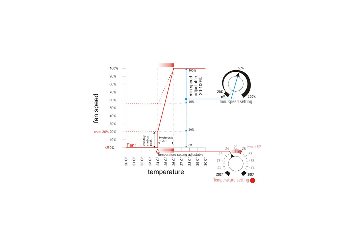 Kontrola minimalnih vrtljajev: Regulator omogoča nastavitev minimalne hitrosti vrtenja ventilatorja v razponu od izklopljeno, 20 % do 100 %. To omogoča, da ventilator deluje pri najnižji hitrosti, kadar ni potrebe po visoki intenzivnosti prezračevanja, kar prispeva k večji energetski učinkovitosti in manjši porabi energije.