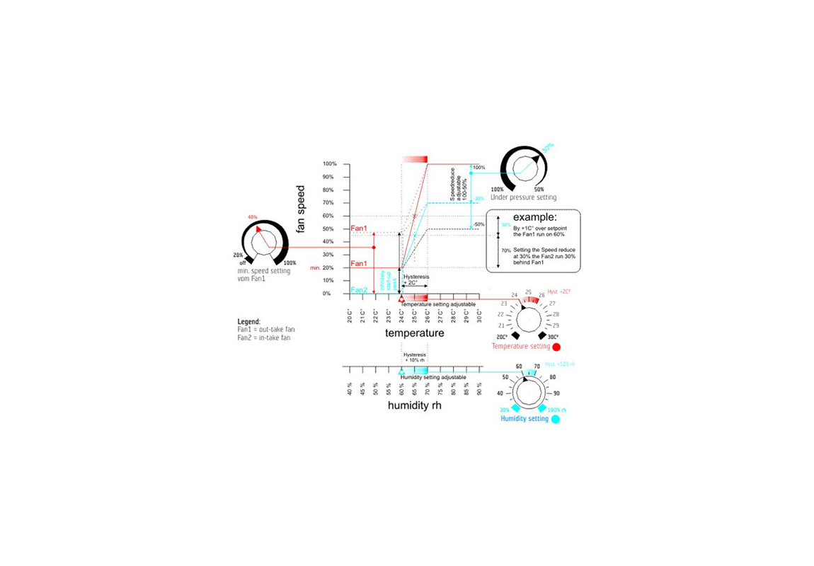 • Stalna regulacija vlage in temperature: Krmilnik ohranja konstantno vlago in temperaturo v prostoru ter preprečuje neprijetne vonjave ali nihanja v okolju, kar je ključno za ohranjanje kakovosti zraka.