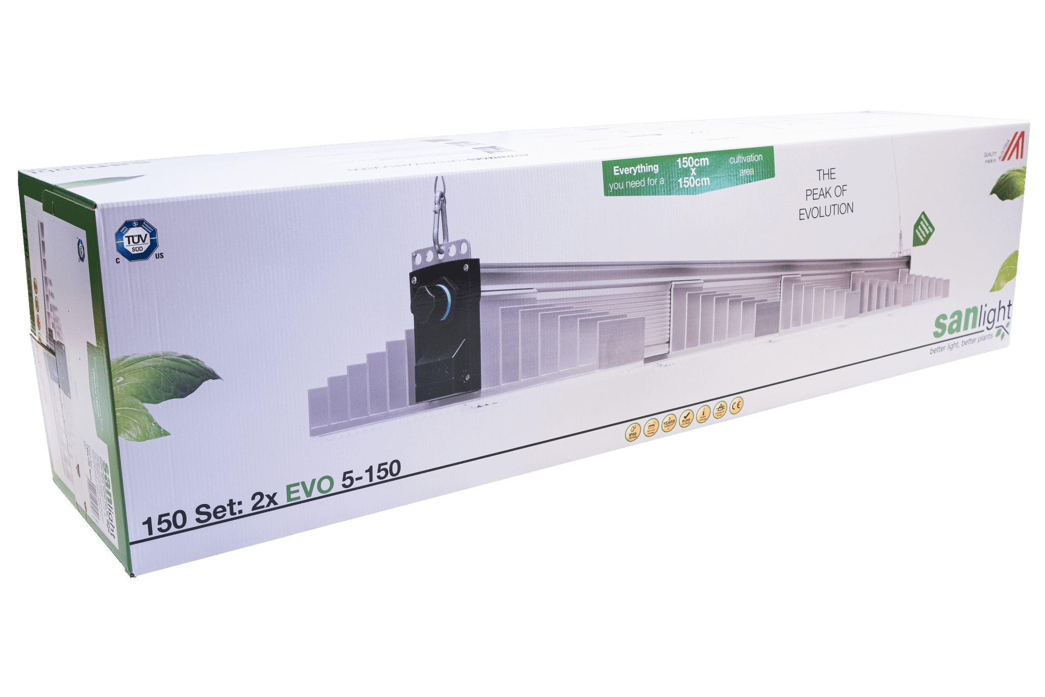 Set SANlight 150 vključuje vse, kar potrebujete za gojenje na površini 150 cm x 150 cm.