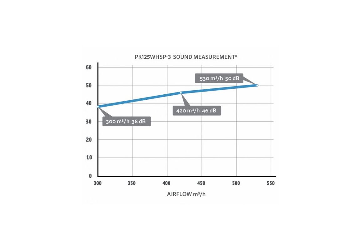• Tri stopnje hitrosti: Omogočajo prilagoditev pretoka zraka na 300 m³/h, 420 m³/h ali 530 m³/h, kar omogoča natančno prilagoditev potrebam prostora.